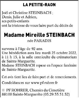Décédée à Moyenmoutier (88420, France) le jeudi 20 octobre 2022 à l'âge de 92 ans