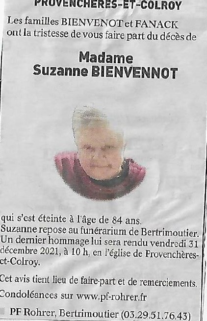 Décédée à Senones (88210, France) le mardi 28 décembre 2021 à l'âge de 84 ans