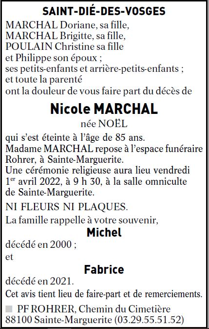 Décédée à Saint Dié (88100, France) le lundi 28 mars 2022 à l'âge de 85 ans